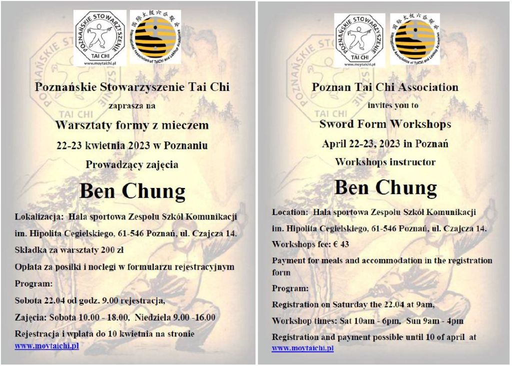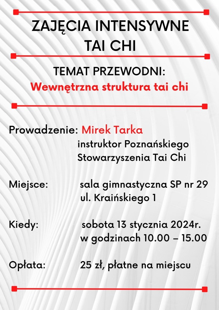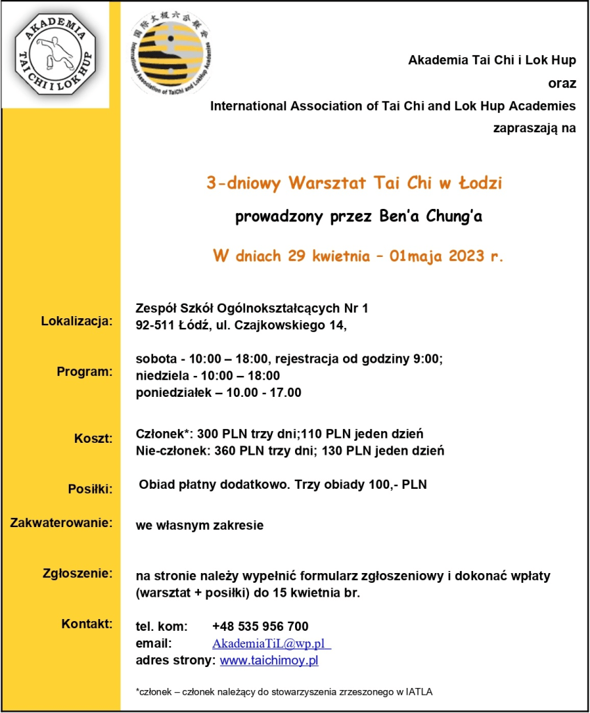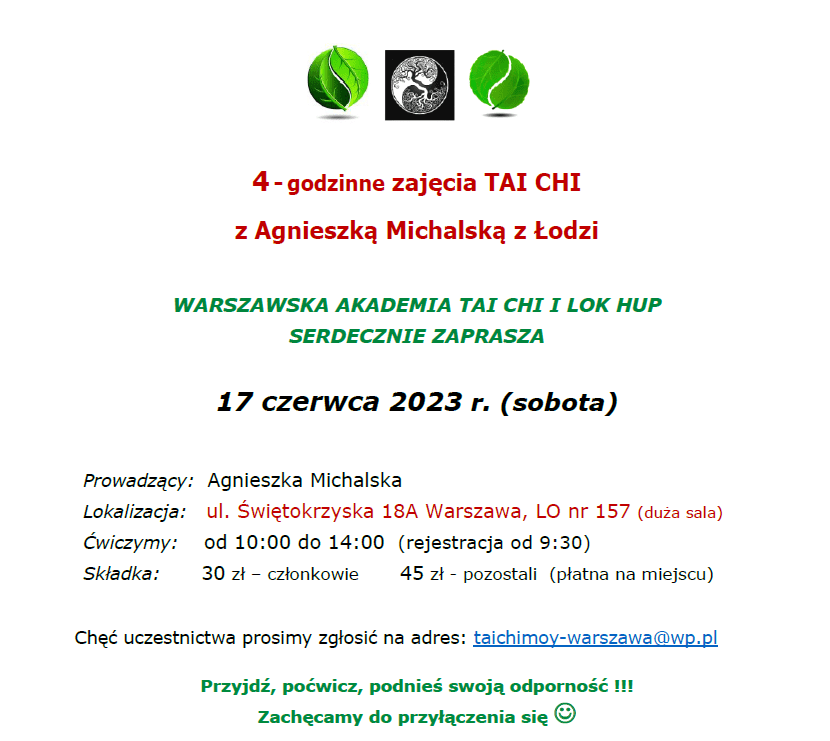 Zarząd Warszawskiej Akademii Tai Chi i Lok Hup serdecznie zaprasza na intensywne zajęcia Tai Chi  w dniu 18 listopada 2023 r. (sobota). Szczegóły tutaj
