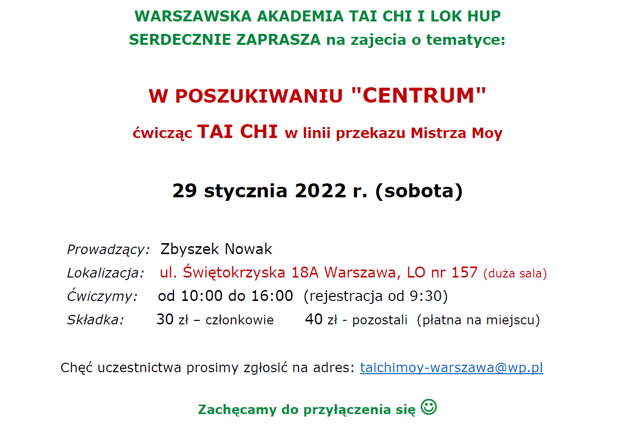 Chęć uczestnictwa prosimy zgłosić na adres: taichimoy-warszawa@wp.pl W przerwie ok. 13.00 oferujemy ciepłą zupę wegetariańską.