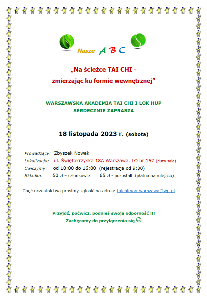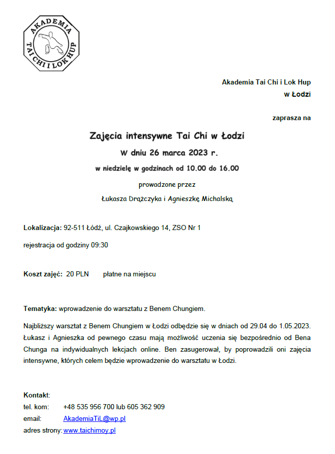 Zarząd Warszawskiej Akademii Tai Chi i Lok Hup serdecznie zaprasza na intensywne zajęcia Tai Chi (plakat w załączniku)