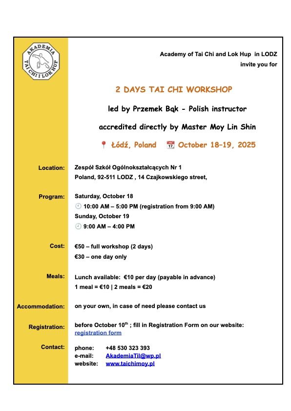 Chęć uczestnictwa prosimy zgłosić na adres: taichimoy-warszawa@wp.pl