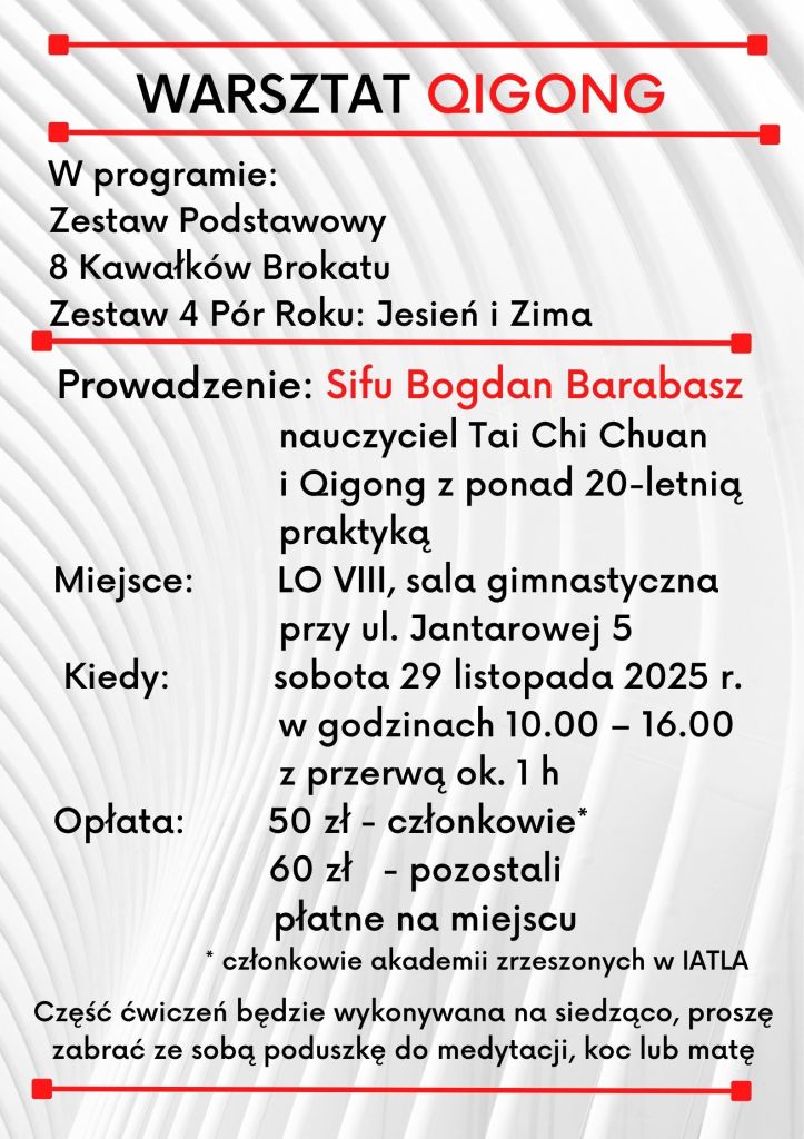 Wrocławska Akademia Tai Chi i Lok Hup zaprasza 29.11.2025 roku na warsztat Qigong.