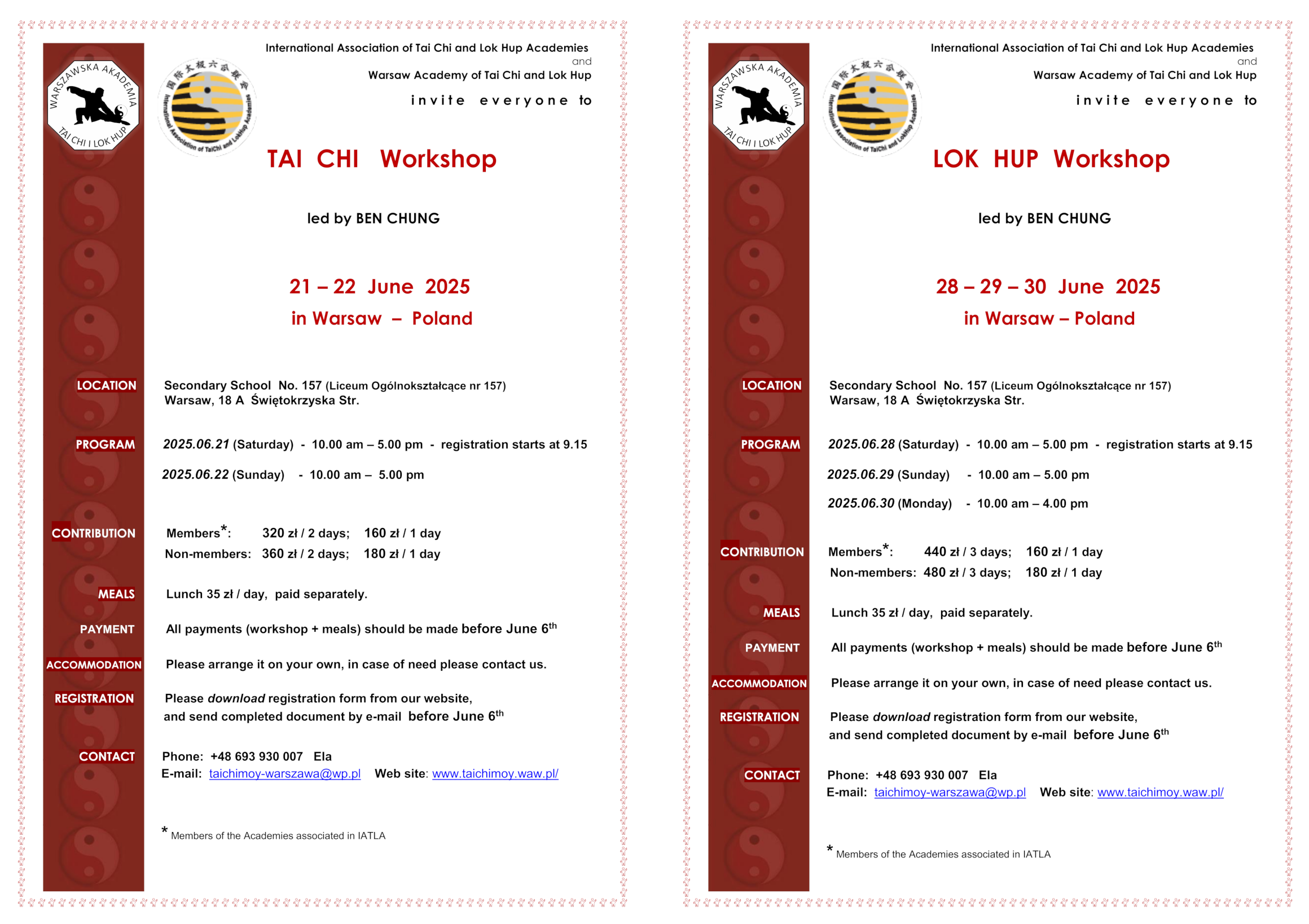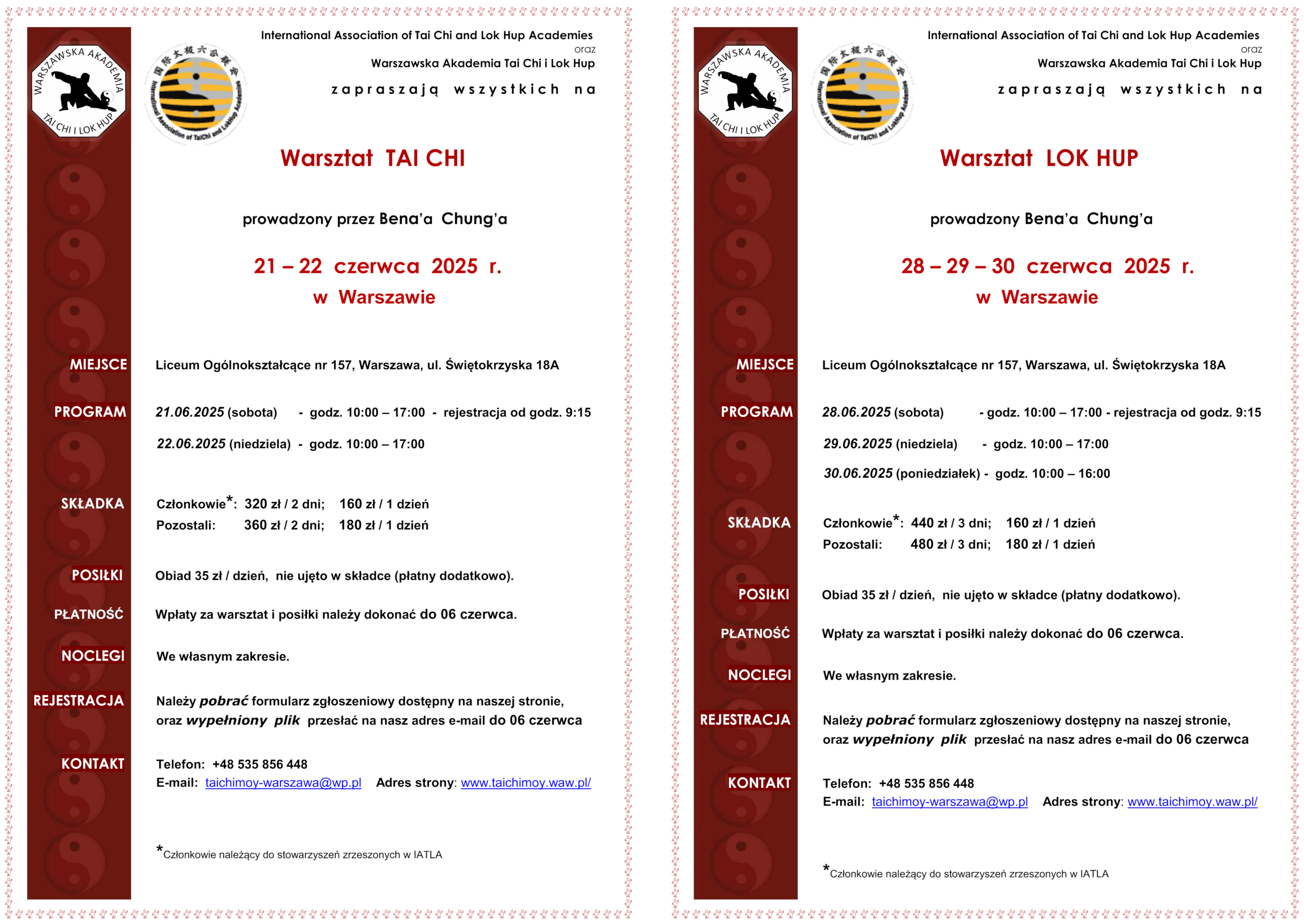 Zarząd Warszawskiej Akademii Tai Chi i Lok Hup serdecznie zaprasza w dniach 28-30 czerwca 2024 r. na warsztat Tai Chi z Benem Chung z Kanady. Szczegóły na załączonym plakacie.